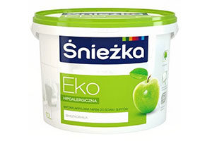 Sniezka Eko, 10л – матовая акриловая краска для стен и потолков. Образует снежно-белые покрытия, которые позволяют стенам «дышать». Не вызывает раздражения, гипоаллергенность подтверждена исследованиями.