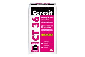 Штукатурка Ceresit CT 36 предназначена для декоративнозащитной отделки поверхности внутри и снаружи зданий по бетонным, подготовленным кирпичным, оштукатуренным основаниям и в системах теплоизоляции фасадов. Возможно получение неограниченного количества различных по внешнему виду фактур.